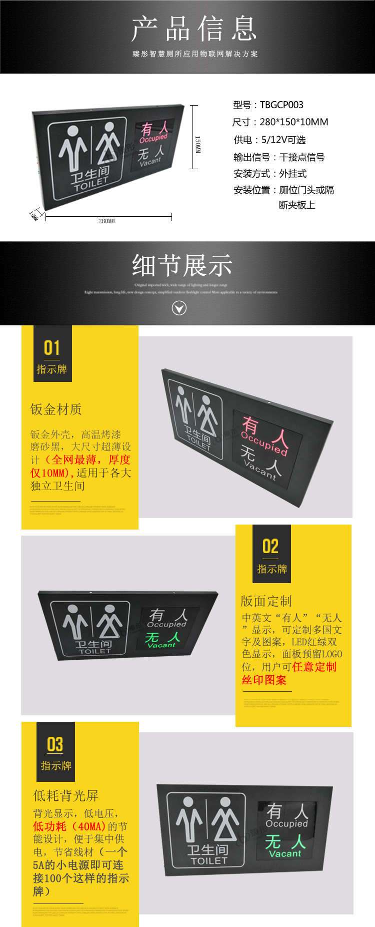 智能厕所有人无人显示屏 厕位状态智能采集 卫生间LED双色指示牌