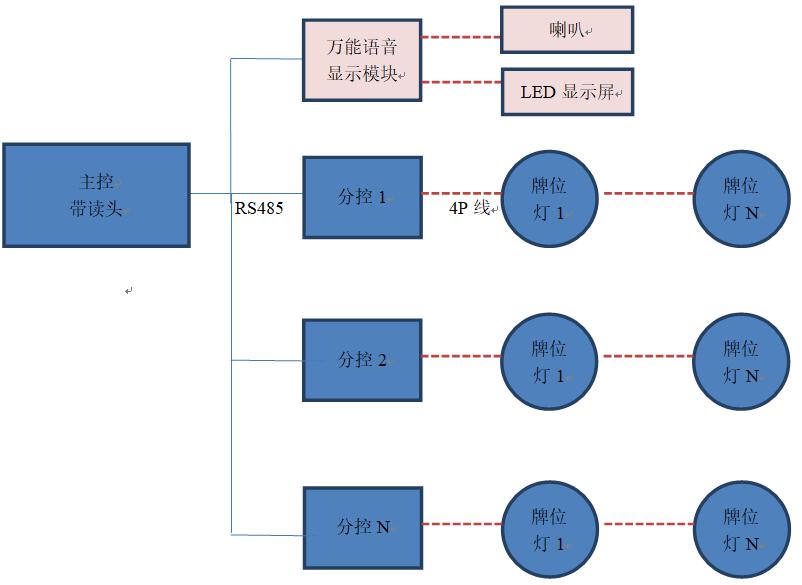 以上几个构成了一个完整的系统,采用主控+分控的架构可以根据现场布线配置多个分控器,每个分控器最多可接4组牌位灯,每组牌位点最多可有100个牌位灯。主控系统最多可接4个分控系统。