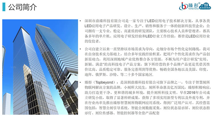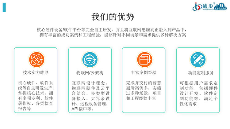 臻彤(Topbeyond)是深圳市鼎臻科技有限公司旗下品牌,臻彤智慧厕所专注于研究智慧公厕物联网解决方案,小厕所大民生,厕所革命惠及亿万国民,臻彤积极响应号召,助力打造更干净、更和谐的城乡环境,提升厕所科技文明。其经营范围包括:智慧公厕引导系统、智能公厕数据采集、厕位状态显示屏、厕位状态指示灯、厕位传感器、智能控制器等全套产品配套,是智慧厕所综合解决方案提供商,做智慧厕所,请认准“臻彤”品牌。